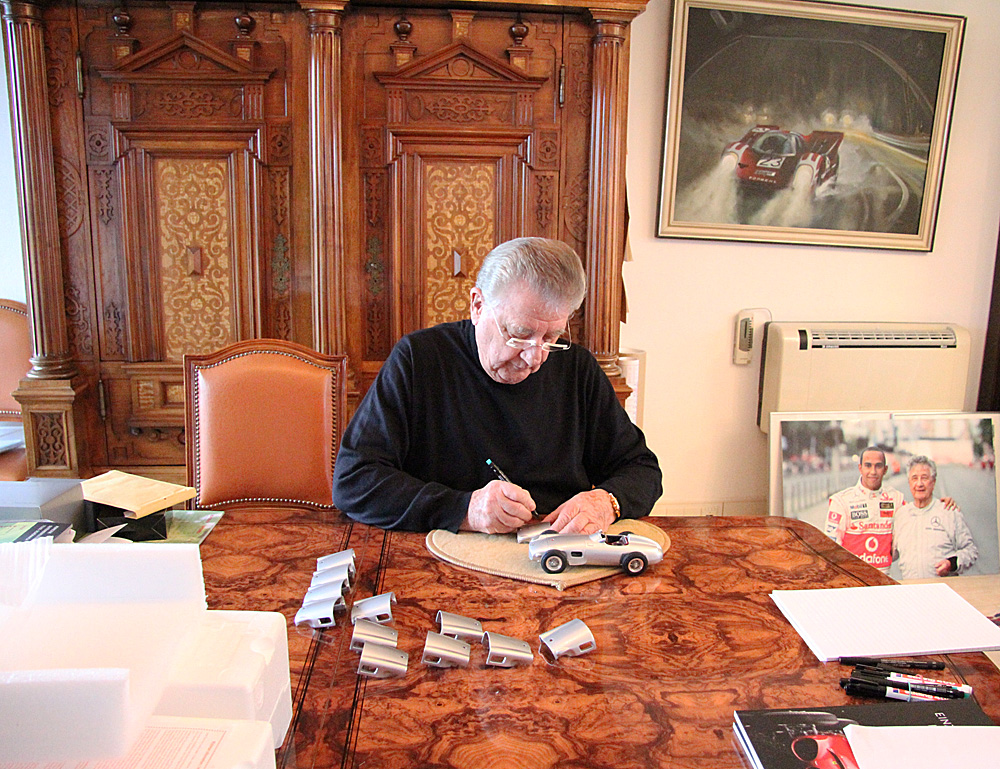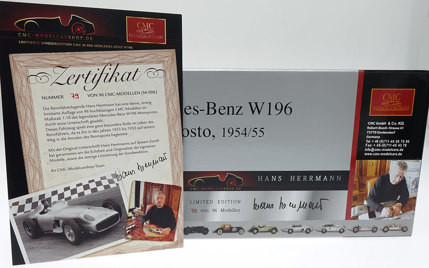 La légende de course flèche d'argent Hans Herrmann a ennobli une petite édition strictement limitée de 96 CMC modèles mondiale de grande classe du légendaire Monoposto Mercedes-Benz W196 avec sa signature. Il est l'une des personnalités des coureurs les plus polyvalents des années 50 et 60.