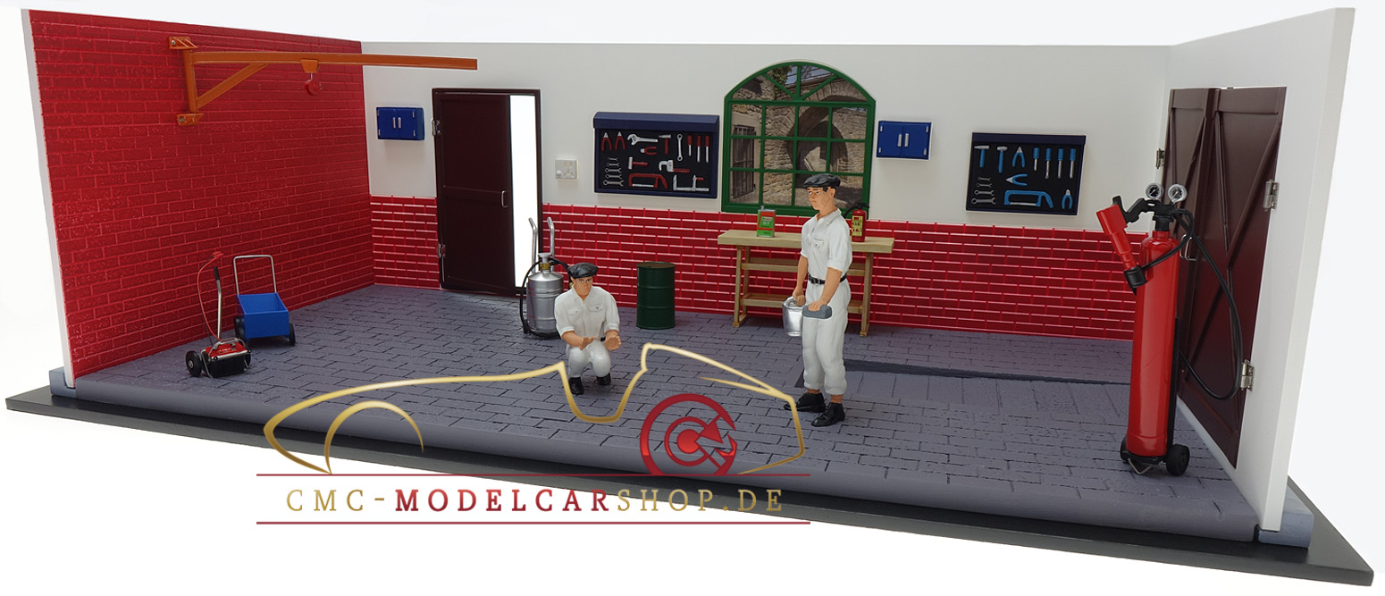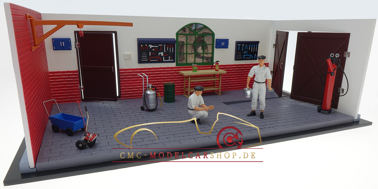 CMC présente un atelier de réparation sous forme de kit facile à installer avec d’intéressants accessoires d’atelier. Au centre se trouve une Alfa Romeo 6C 1750 GS qui nécessite un examen. Deux mécaniciens effectuent le travail. Les portes qui s'ouvrent sur les murs extérieurs du garage peuvent être qualifiées de très réussies. Le modèle Alfa est inclus dans le prix.